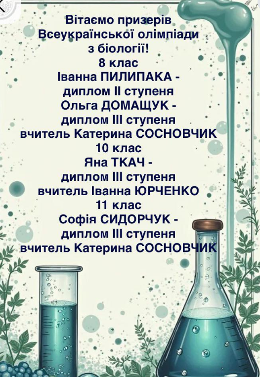 І місце у ІІ етапі Всеукраїнської учнівської олімпіади з біології посіли такі здобувачі освіти БЕРЕЗНІВСЬКОГО ЛІЦЕЮ N2: