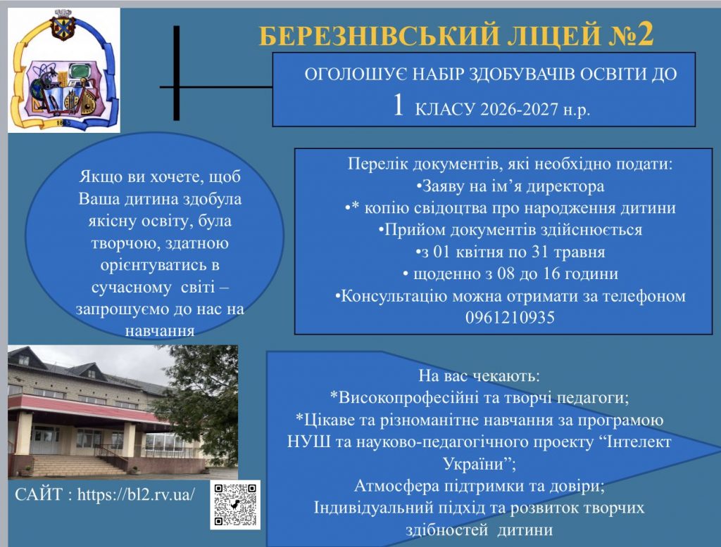 Новини Набір до 1-го класу 2026-2027 навчального року admin 24.03.2026 Continue Reading Previous: Сила в єдності! Залишити відповідь Скасувати коментарВаша e-mail адреса не оприлюднюватиметься. Обов’язкові поля позначені *Коментар * Ім'я * Email * Сайт Зберегти моє ім'я, e-mail, та адресу сайту в цьому браузері для моїх подальших коментарів.
